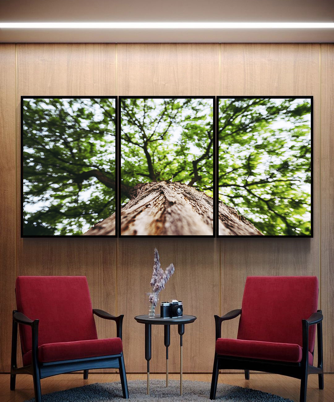 Com folhagem verde vibrante e tronco imponente, este Trio de Quadros é a escolha ideal para salas, quartos ou halls de entrada.