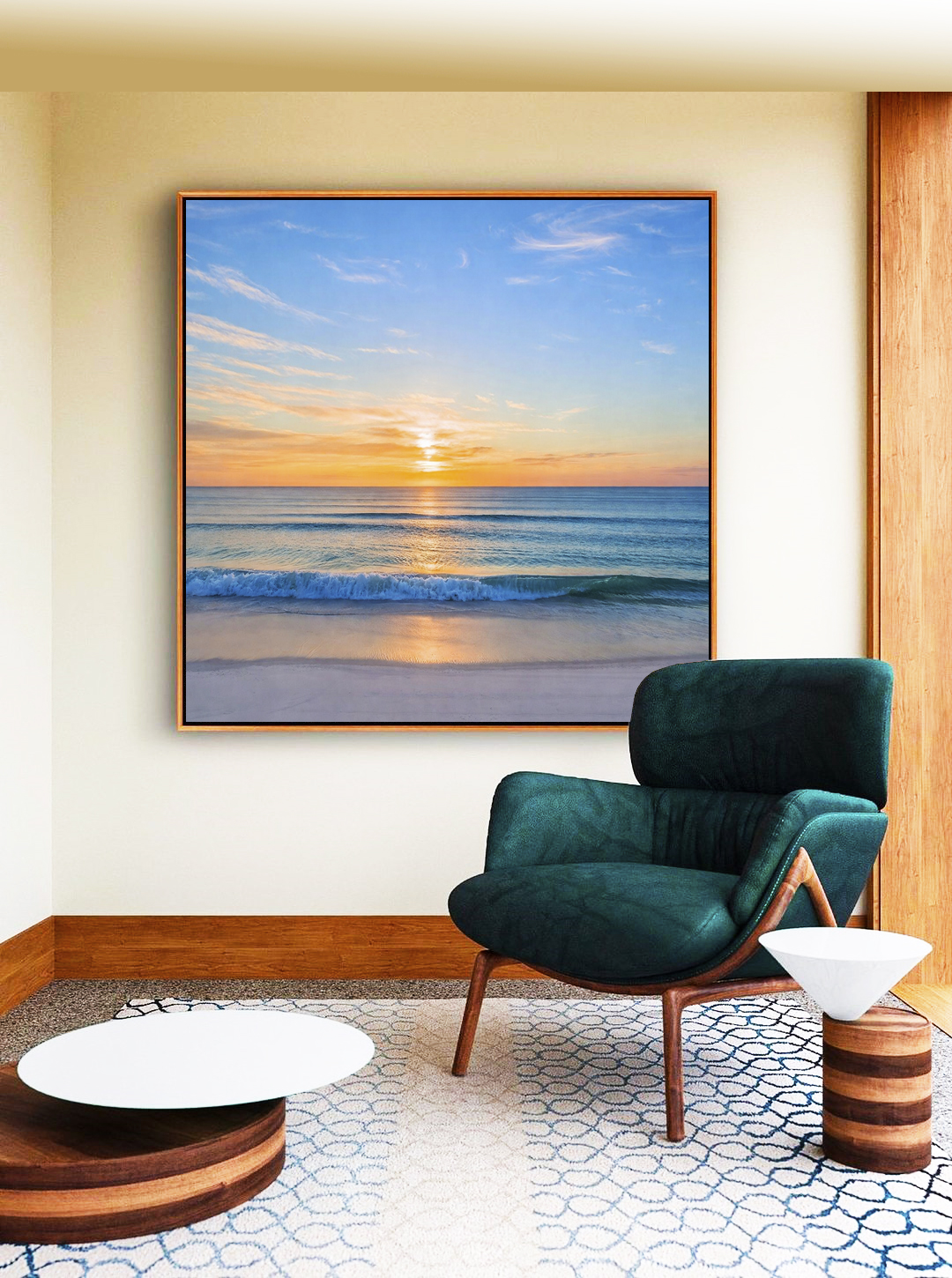 Sereno e inspirador, este Quadro Quadrado com nascer do sol na praia e mar azul cria atmosfera leve e sofisticada, trazendo frescor ao décor. Ideal para decorar sua sala elegante, quarto refinado ou hall de entrada com presença marcante.