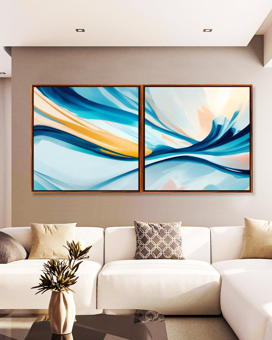 Duo de Quadros Quadrados com arte fluida abstrata em azul, rosa e amarelo. Moldura Extra Fina Flutuante e impressão em Canvas de alta definição. Perfeitos para decorar salas contemporâneas, halls de entrada ou escritórios sofisticados. Lindos!
