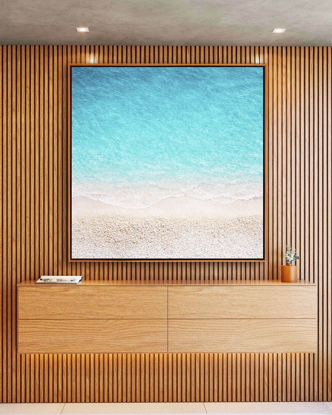 Natural e marcante, este Quadro Quadrado de praia com areia branca e mar azul turquesa cria ponto focal sofisticado e sensação de refúgio no ambiente. Ideal para compor salas modernas, quartos elegantes ou halls de entrada de destaque.