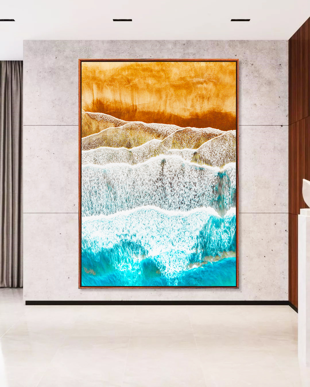 Este Quadro Vertical captura a tranquilidade do mar azul claro e a franja de espuma sobre a areia. Ideal para decorar seu escritório, quarto ou sala de estar, trazendo harmonia, frescor e um toque natural sofisticado à sua decoração.