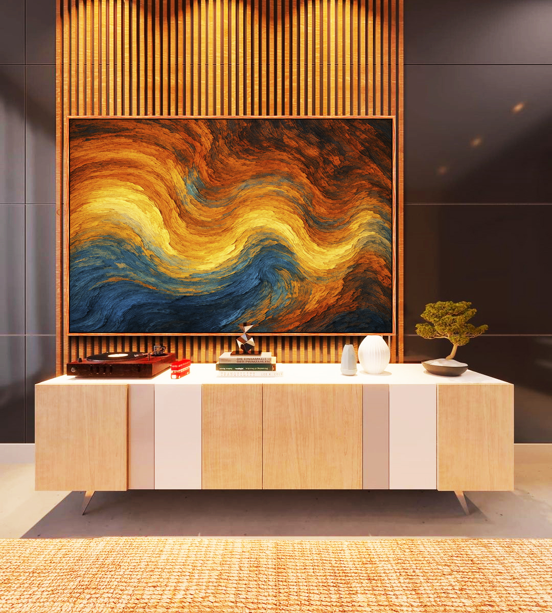 Arte abstrata com ondulações em laranja, amarelo e azul, trazendo energia, calor e movimento visual. Ideal para quartos, salas modernas, escritórios ou hall de entrada criando ambiente contemporâneo, vibrante e sofisticado.