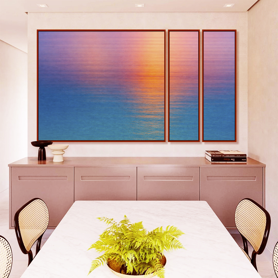 Delicado e marcante, este Trio de Quadros Estilizados de natureza com mar azul e céu rosa ao pôr do sol cria ponto focal elegante. Ideal para compor salas sofisticadas, quartos estilosos, escritórios modernos ou halls de entrada de destaque.