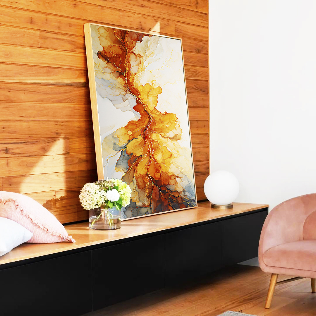 Cores fluidas em harmonia criam impacto visual no formato vertical. Amarelo, dourado e cinza se misturam com leveza e elegância. Perfeito para halls altos, escritórios modernos ou quartos sofisticados. Moldura extra fina flutuante e moderna.