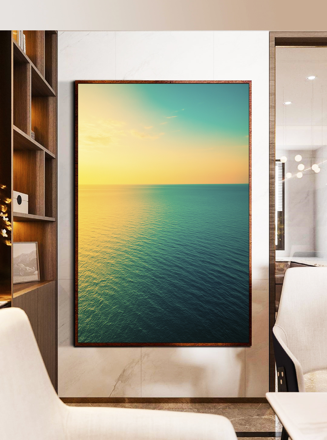 O equilíbrio entre o mar turquesa sereno e o pôr do sol cria uma atmosfera de paz e harmonia. Este Quadro Vertical é a escolha certa para decorar salas, escritórios ou quartos com elegância natural e beleza atemporal.