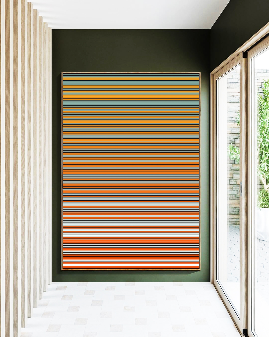 Com listras marcantes e transições suaves de cor, este Quadro Vertical abstrato transmite dinamismo e elegância. Ideal para salas amplas, escritórios ou halls de entrada, ele transforma o espaço com um visual moderno e sofisticado.