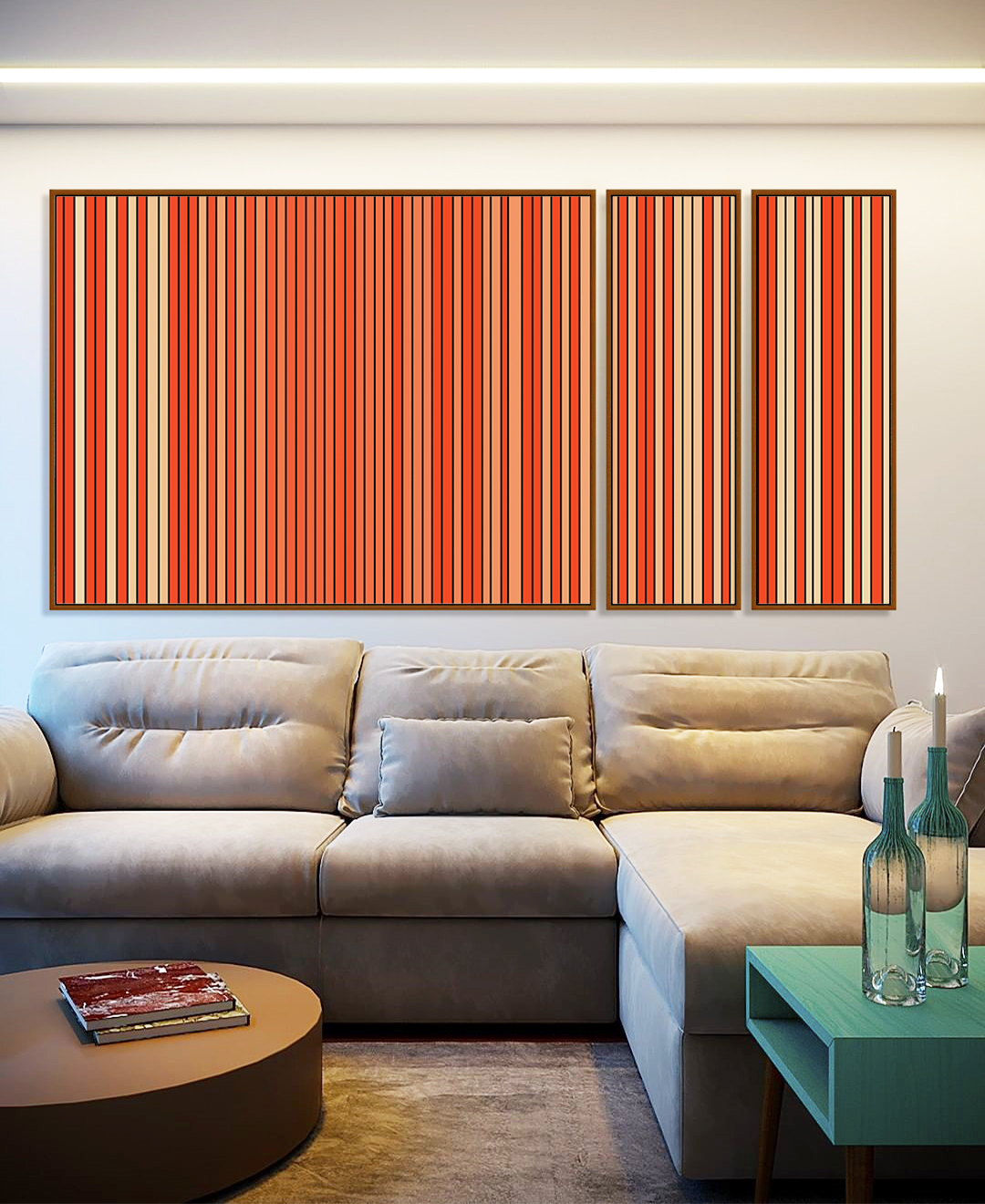Transforme seu espaço com este Trio de Quadros Estilizados Abstrato degradê em listras laranja, coral e marfim. A escolha ideal para decorar sua Sala, Quarto ou Hall de entrada com estilo moderno, cor vibrante e sofisticação única.