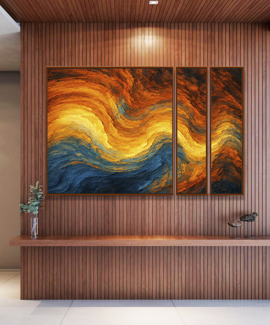 Arte abstrata com ondulações em laranja, amarelo e azul, trazendo energia, calor e movimento visual. Ideal para quartos, salas modernas, escritórios ou hall de entrada criando ambiente contemporâneo, vibrante e sofisticado.