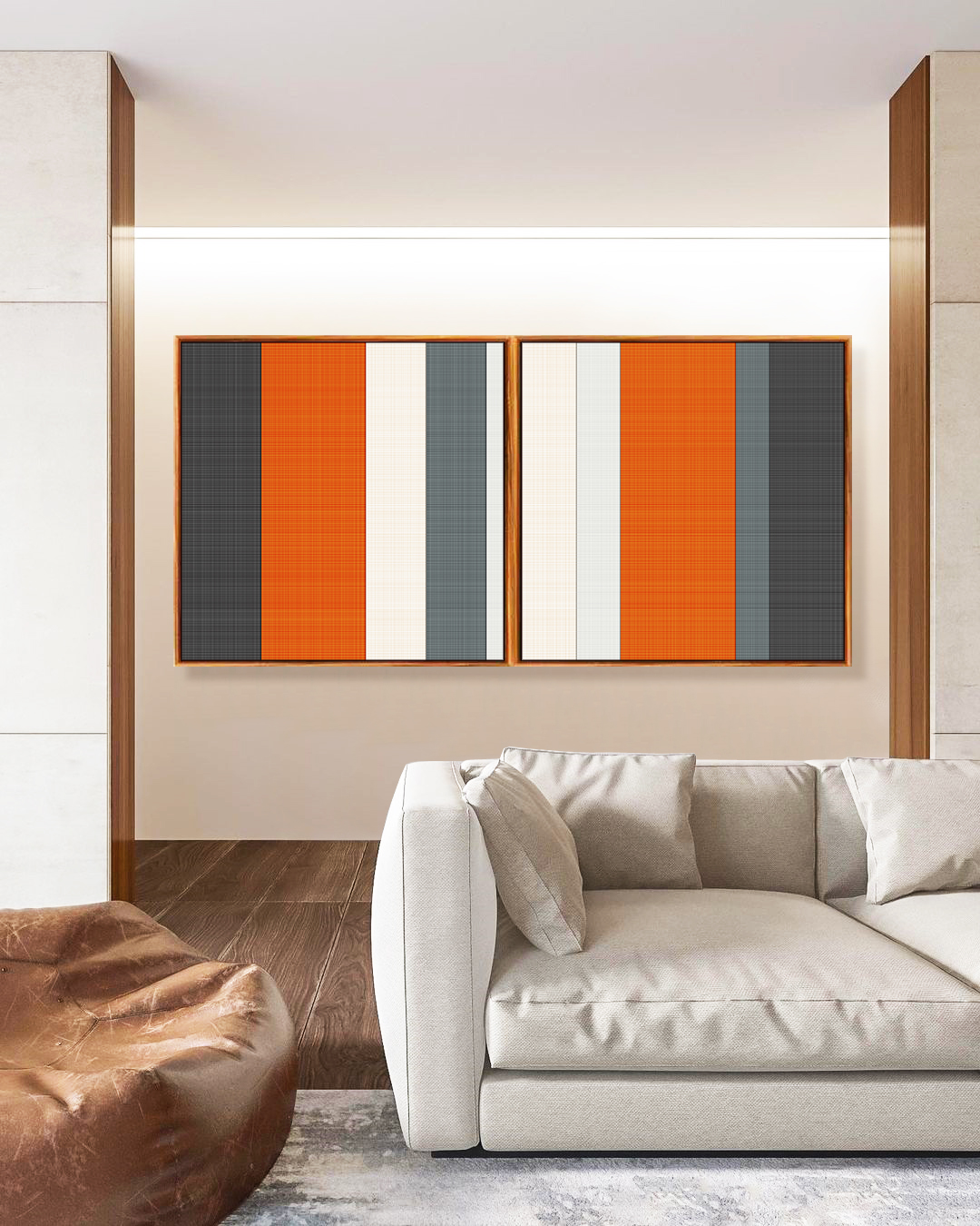 Este Duo de Quadros Quadrados abstrato combina listras em laranja, branco e cinza, criando uma composição moderna e sofisticada. A escolha ideal para valorizar salas de estar, quartos elegantes, escritórios contemporâneos bem iluminados.