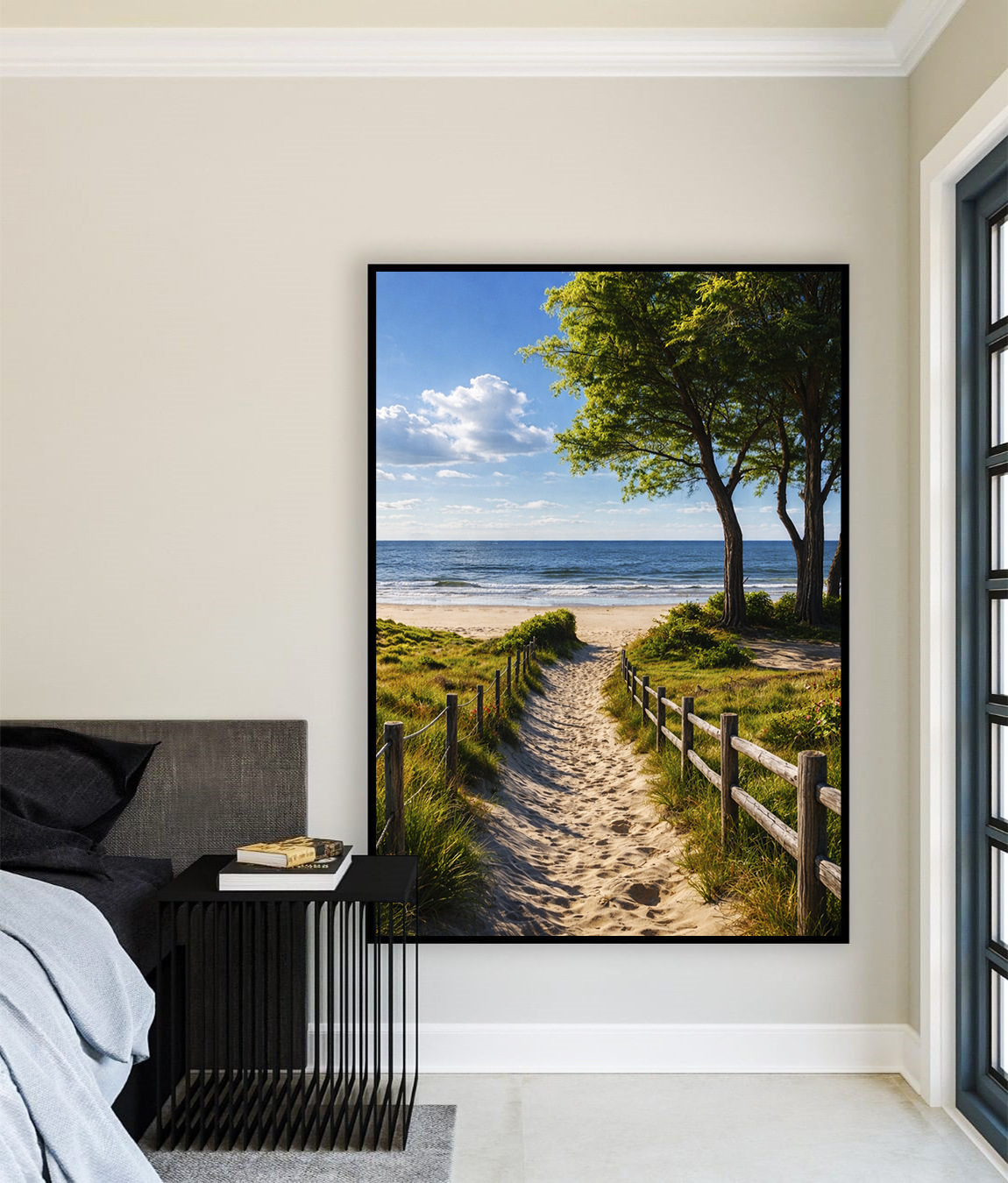 Estrada, árvores e mar se encontram em uma composição que transmite tranquilidade e profundidade. O Quadro Vertical é ideal para decorar salas de estar, escritórios refinados ou quartos, trazendo arte paisagística e conexão com a natureza.
