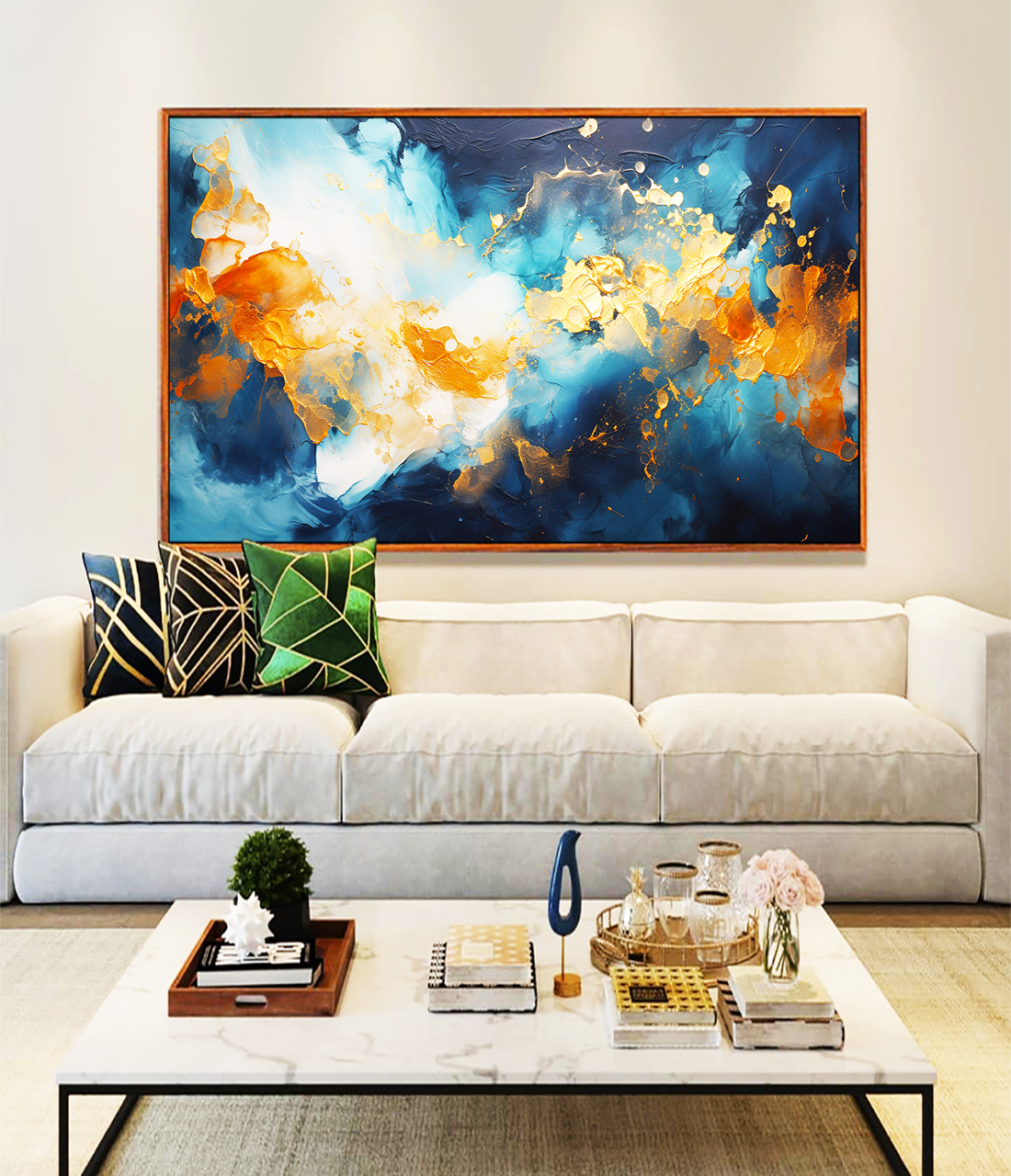 Composição elegante em azul, branco e dourado, este Quadro Horizontal Abstrato estilo pouring transforma sua decoração com sofisticação. Moldura Moderna realça os detalhes. Ideal para dar charme exclusivo à sua Sala de Estar, Quarto e Escritório.