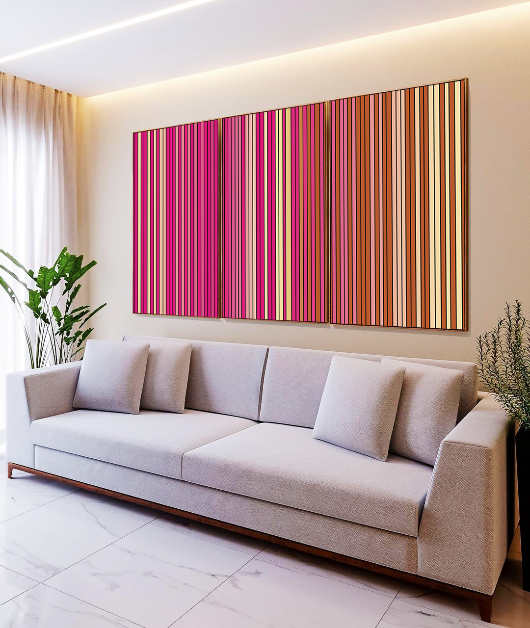 Este Trio de Quadros abstratos geométricos em degradê rosa choque, bege e caramelo é a escolha perfeita para ambientes sofisticados. Com moldura moderna, realça paredes de salas, quartos ou halls, criando uma atmosfera contemporânea e elegante.