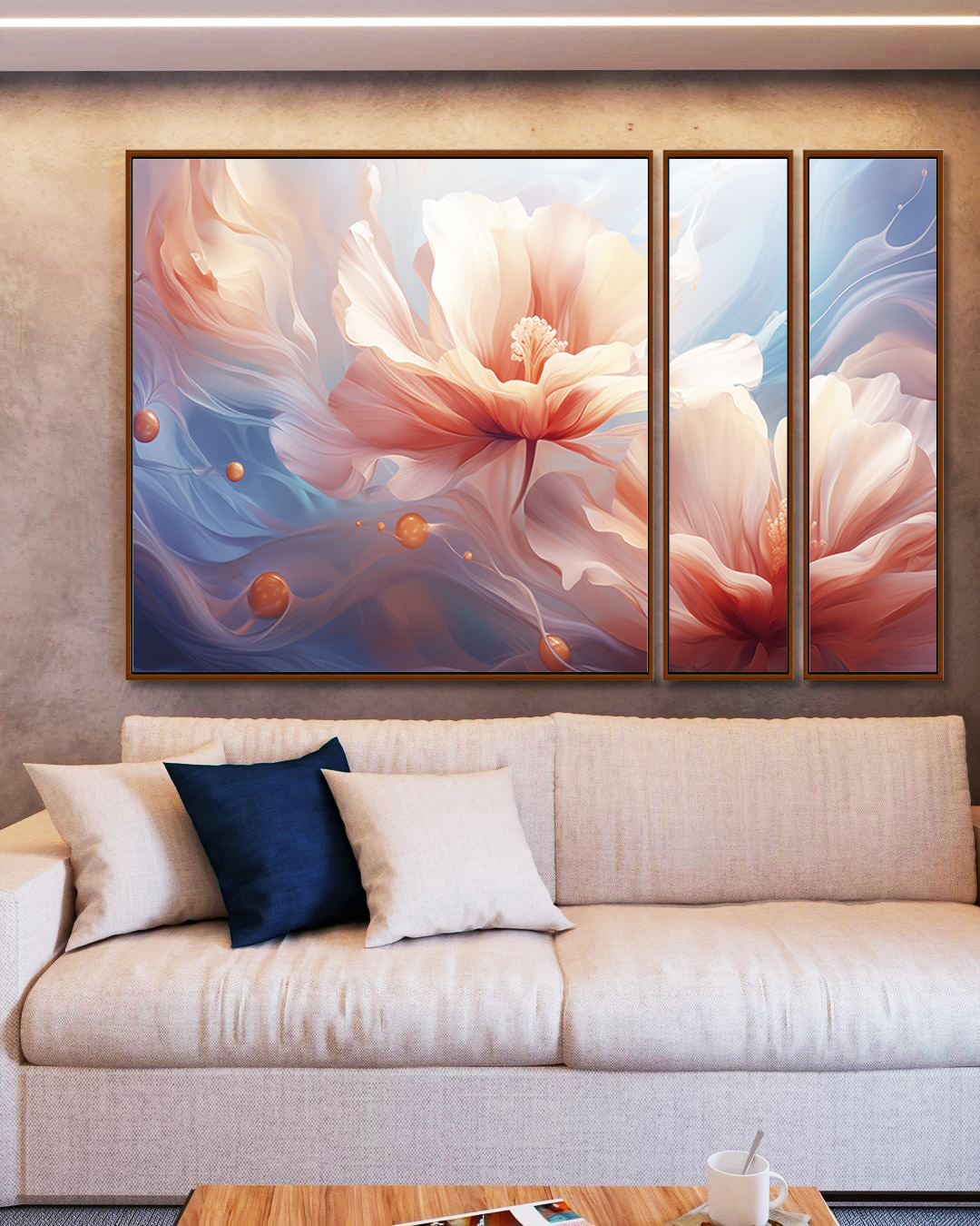 Arte que encanta: Trio de Quadros Estilizados com flores brancas, rosas e azul em composição fluida e moderna. Acabamento em Canvas com Moldura Moderna. Ideal para salas de estar elegantes, halls marcantes ou escritórios com estilo delicado e artístico.