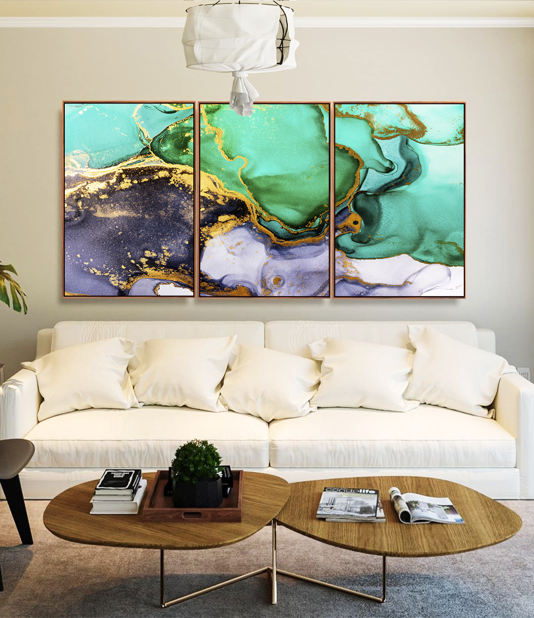 A fusão do verde turquesa, dourado e cinza cria um efeito fluido hipnotizante neste Trio de Quadros. Uma escolha sofisticada para quem deseja adicionar elegância e leveza à sala, quarto ou escritório. Moderno e Impactante!