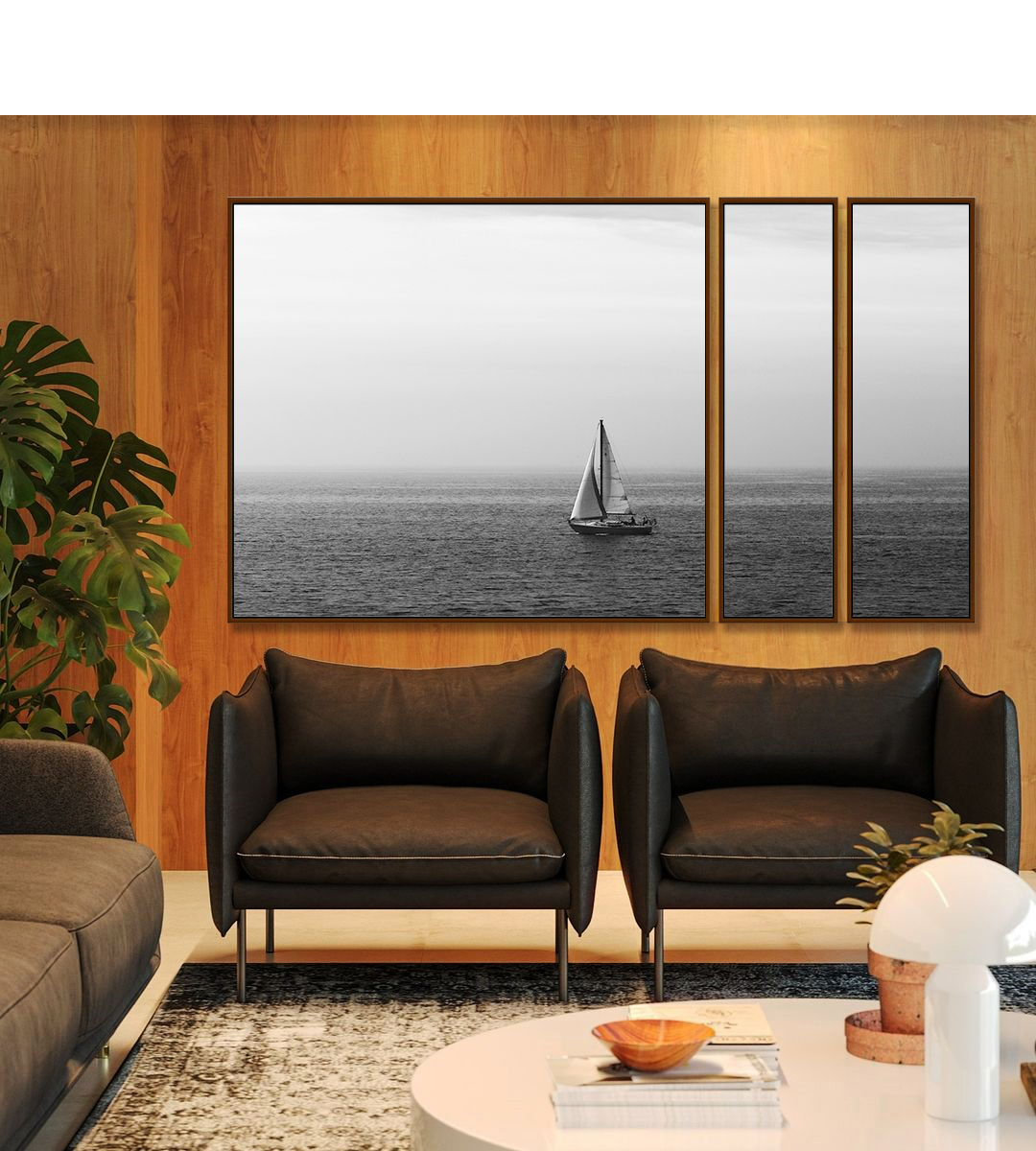 A cena de barco solitário em mar aberto, em tons de preto e branco, traduz elegância e introspecção. Este Trio de Quadros Estilizados é a escolha certa para salas de estar, quartos ou escritórios, valorizando o ambiente com arte atemporal.