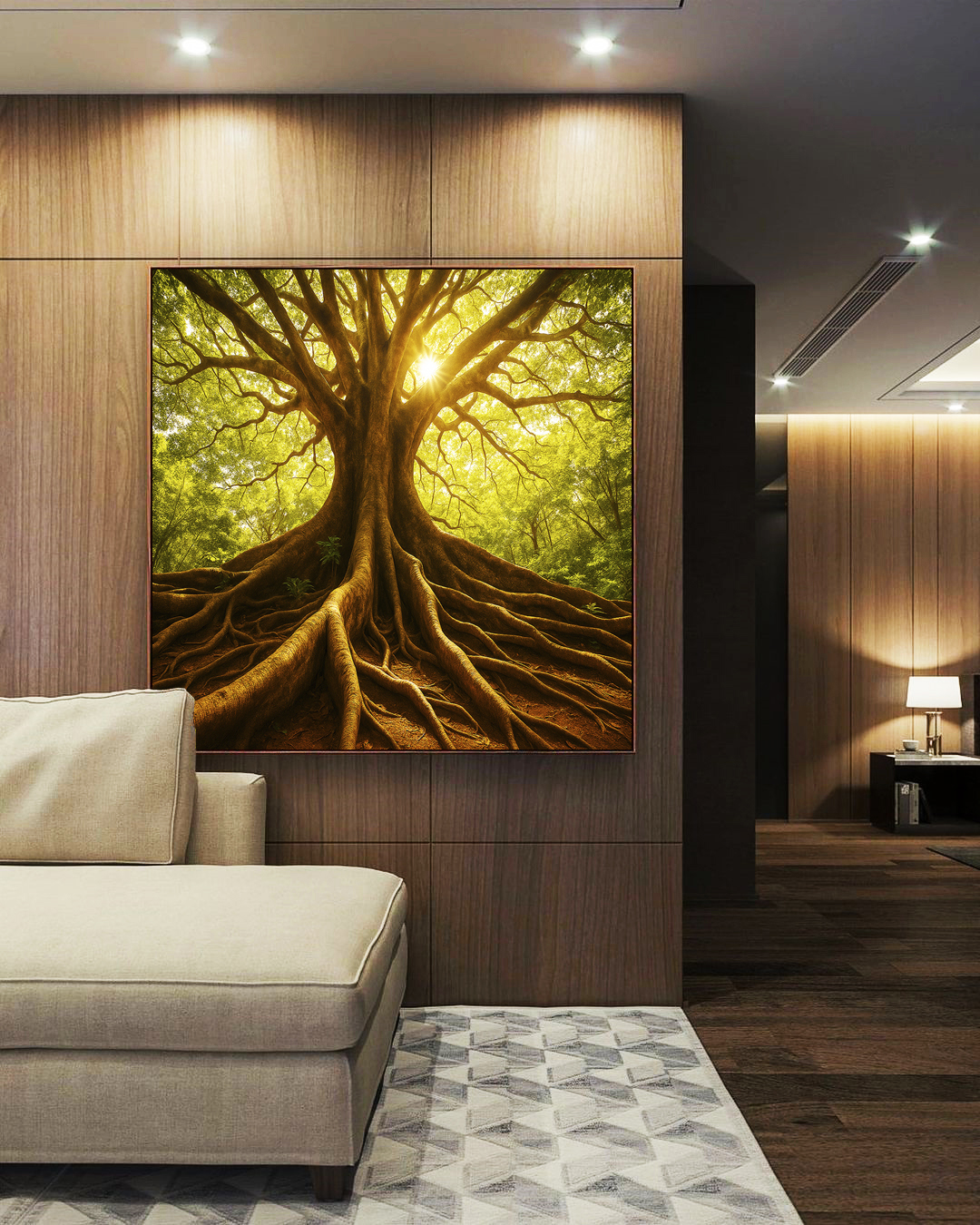 Este Quadro Quadrado se destaca pela beleza serena da natureza. O verde das folhas e o contraste da paisagem criam harmonia visual e leveza. Ideal para sala, quarto ou hall de entrada, trazendo frescor e sofisticação ao seu ambiente.