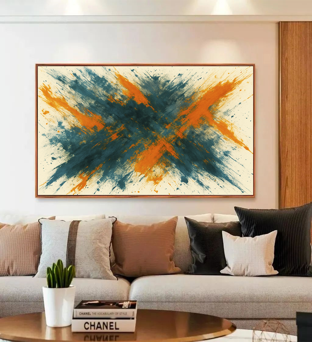 Este Quadro Horizontal combina azul petróleo e laranja tangerina em efeito pintura vibrante. Com moldura extra fina flutuante, é perfeito para salas, escritórios e halls de entrada, adicionando sofisticação e energia ao espaço.
