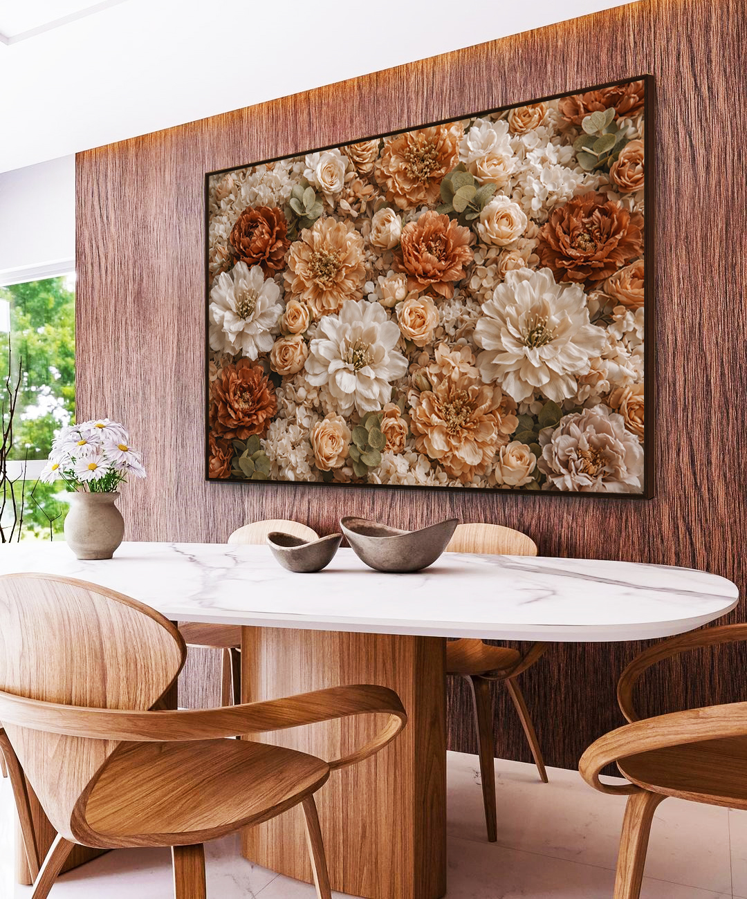 Flores exuberantes como peônias, rosas e dálias criam uma atmosfera romântica e refinada. Perfeita para salas de estar, quartos, halls e espaços que valorizam beleza, leveza e estilo atemporal.