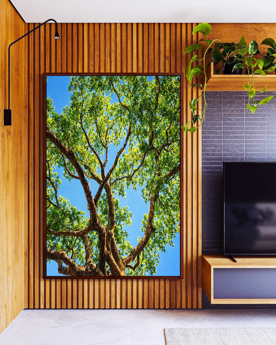 Copa de árvore com folhas verdes e céu azul vivo, criando uma sensação de leveza e conexão com a natureza. Luz natural e frescor que transformam o ambiente. Perfeito para salas e quartos, trazendo calma e equilíbrio.