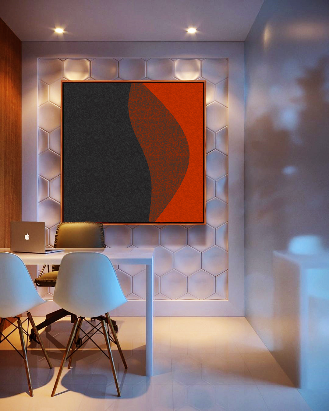Com contrastes marcantes em preto e vermelho telha, este Quadro Quadrado Minimalista expressa força e estilo contemporâneo.