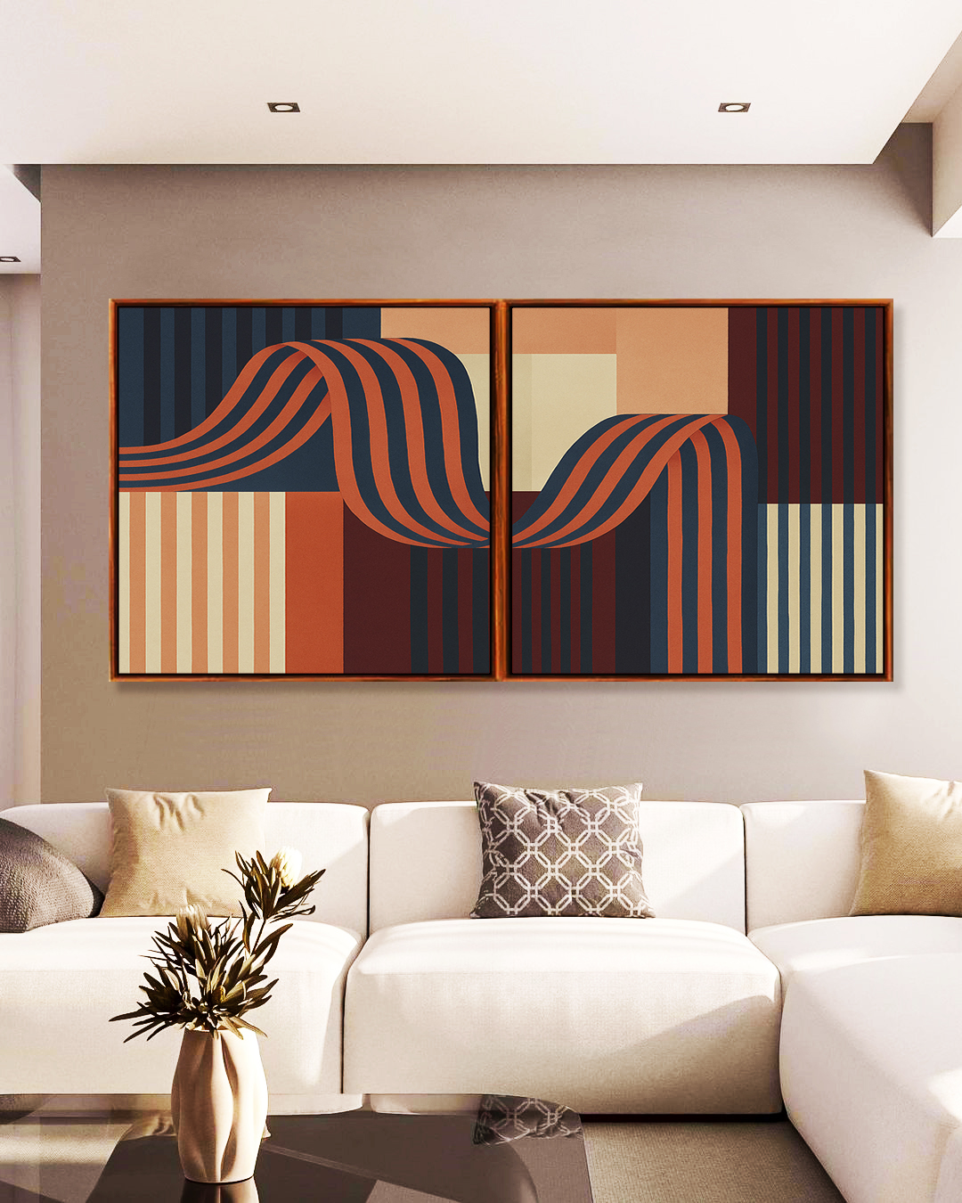 Duo de Quadros Quadrados Abstrato Geométrico em tons harmônicos de azul, salmão e bordô. Em Canvas com Moldura Flutuante, transforma sua sala, quarto ou escritório em um espaço elegante, moderno e cheio de estilo visual.