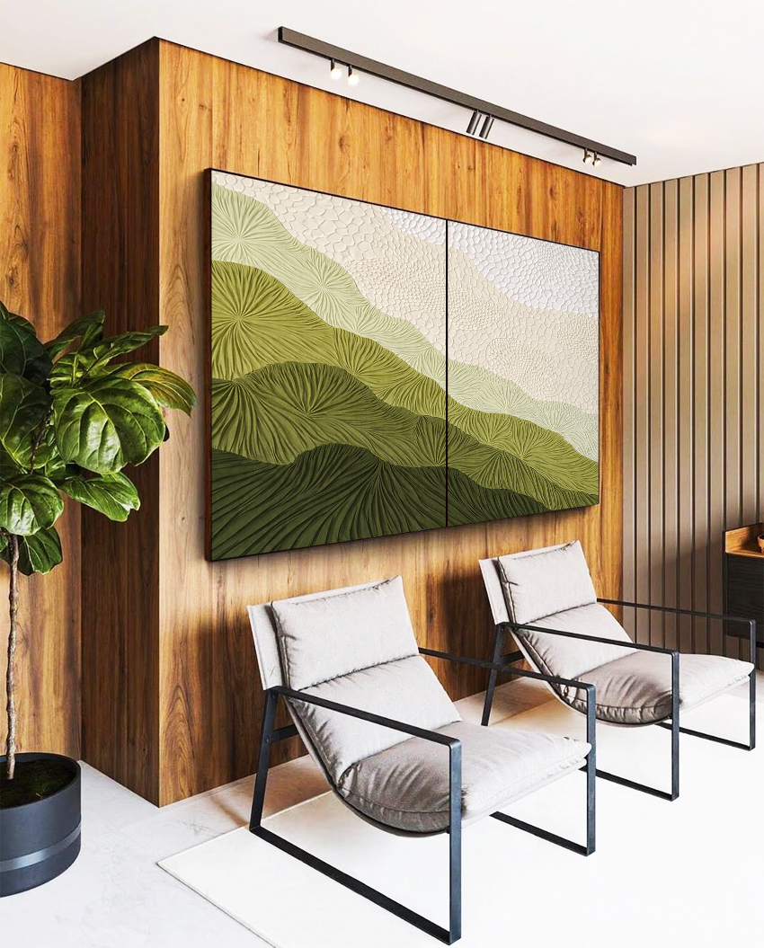 Este Duo de Quadros combina tons de marfim e verde em um degradê abstrato de textura delicada, trazendo equilíbrio visual e leveza. Ideal para valorizar salas amplas, quartos sofisticados ou halls de entrada elegantes.