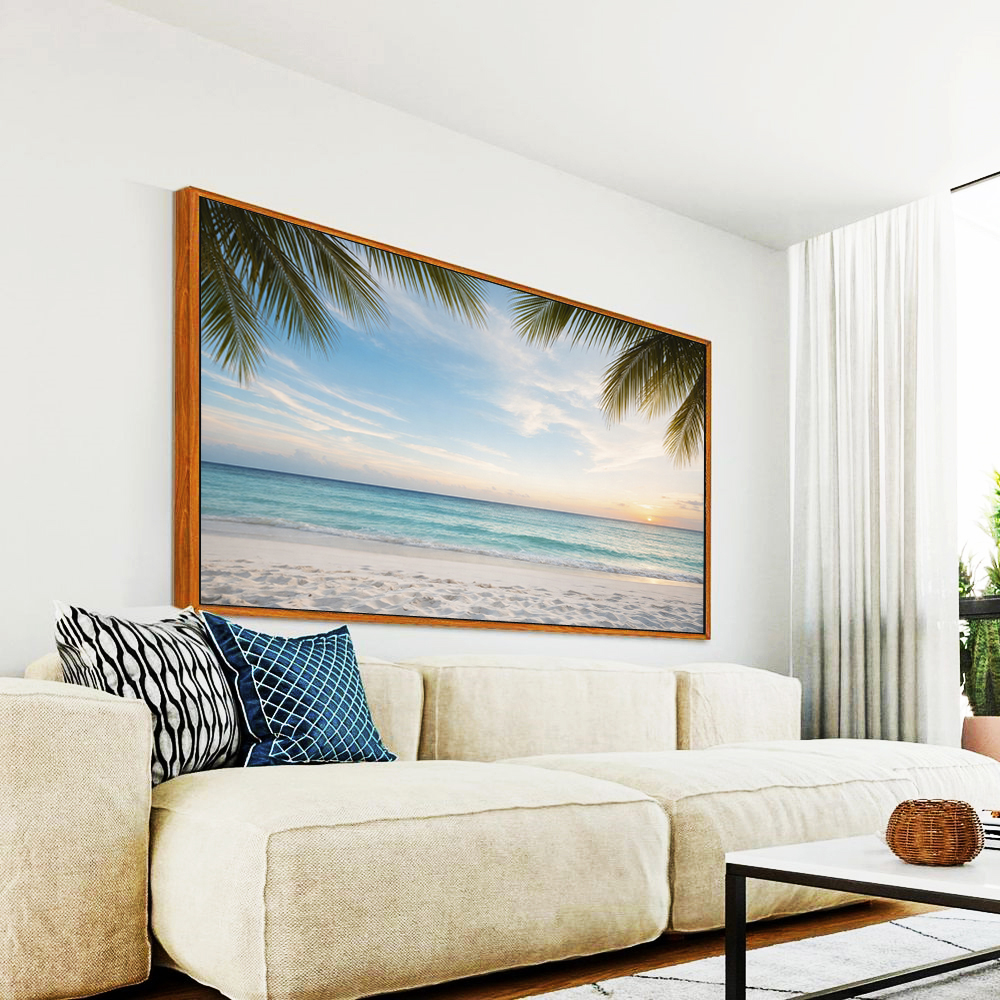 Sol iluminando a areia clara, mar tranquilo e coqueiros ao vento, criando uma atmosfera leve e tropical. Ideal para sala, quarto ou espaços que pedem frescor e paz. Lindo e Iluminado!