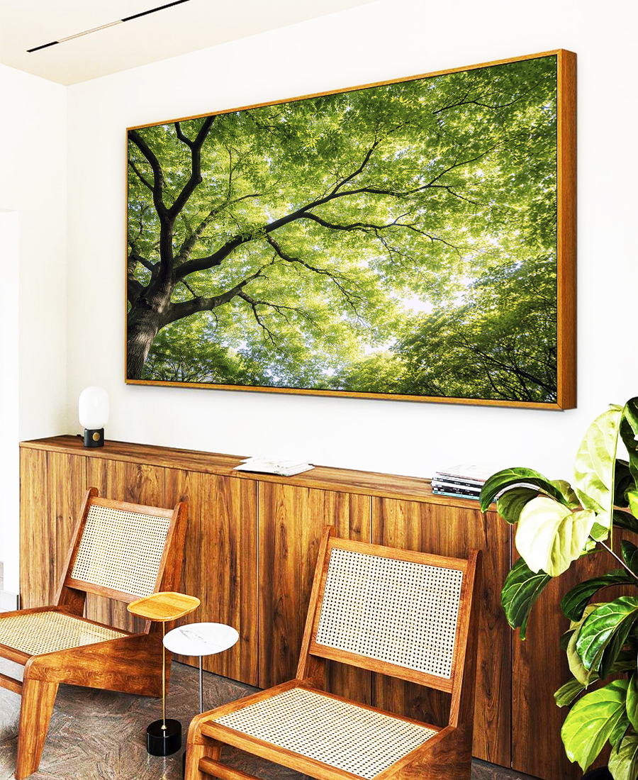 Folhas verdes vibrantes em uma árvore cheia de vida, trazendo frescor e harmonia para o ambiente. Ideal para sala, quarto, escritório ou espaços que pedem um toque natural e acolhedor.