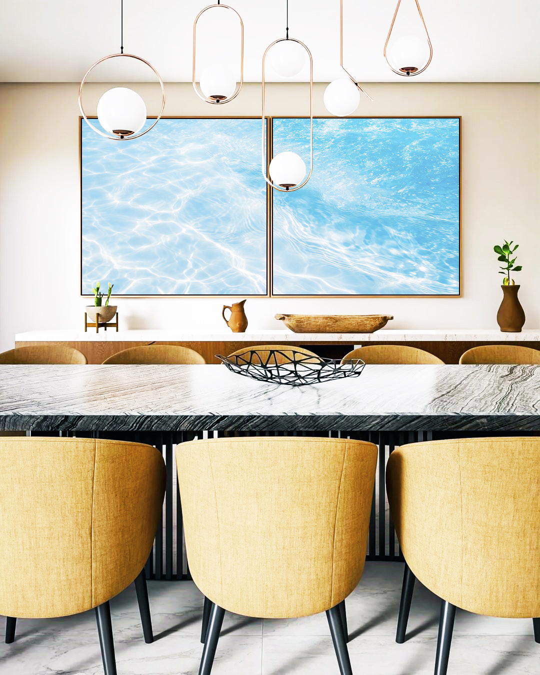 Mar azul claro com reflexos do sol e areia suave abaixo, trazendo frescor e tranquilidade ao ambiente. Ideal para salas, quartos e espaços que pedem leveza. Refrescante e Belíssimo!