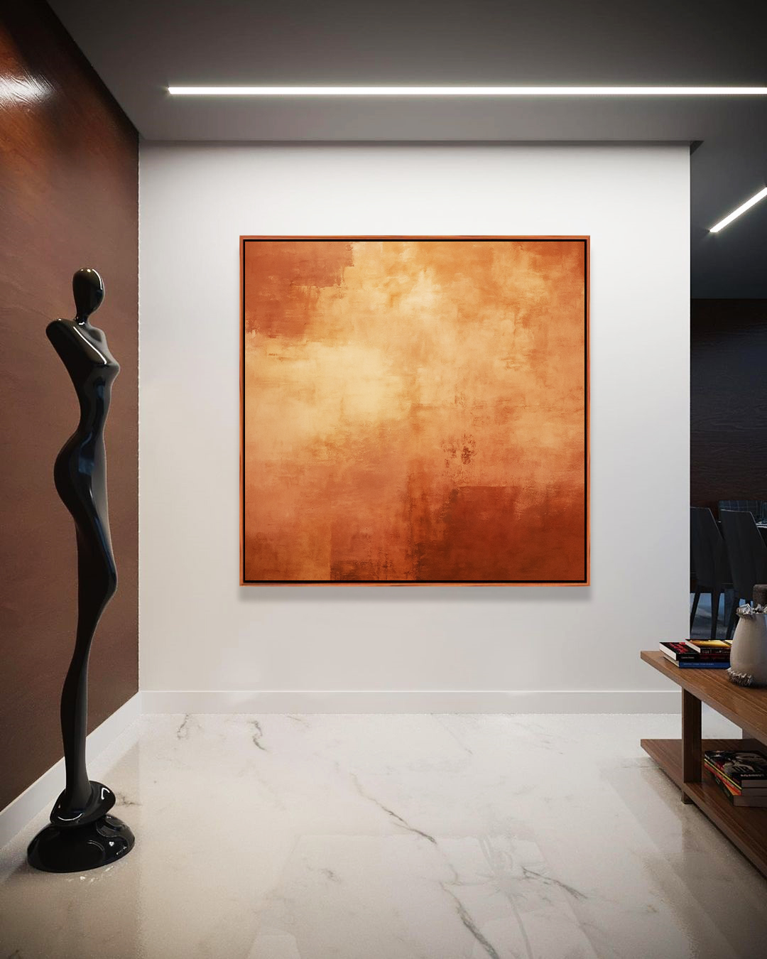 Quadro Quadrado abstrato com textura em marrom terra, bronze e caramelo. Sua moldura extra fina flutuante realça o estilo contemporâneo, perfeito para salas de estar, quartos ou escritórios, oferecendo sofisticação e aconchego ao ambiente.