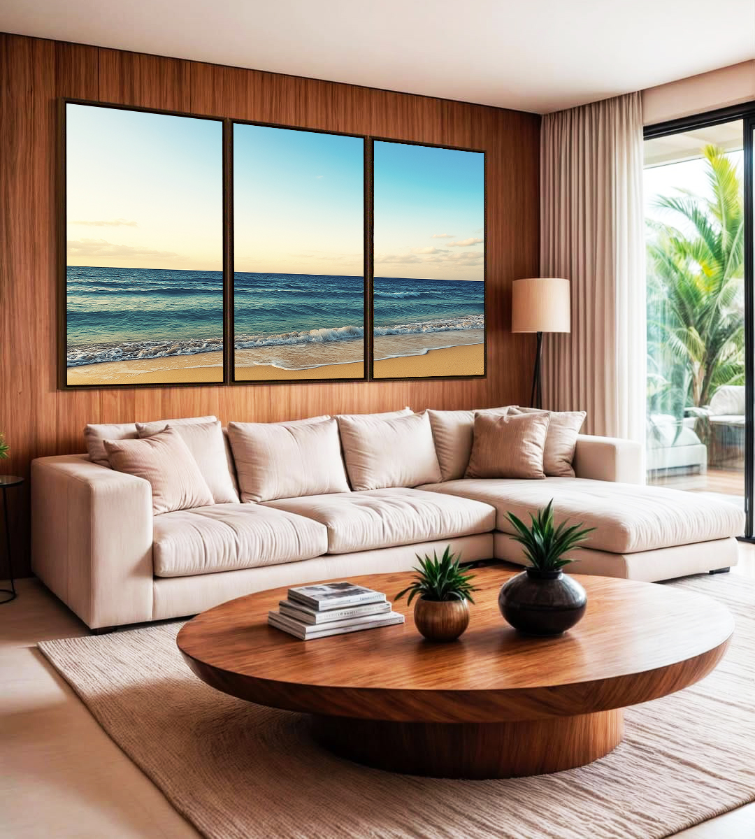 Este Trio de Quadros traz a beleza serena do mar e do céu em perfeita harmonia. A escolha ideal para quem deseja um ambiente moderno, iluminado e acolhedor. Excelente opção para salas, quartos ou escritórios.