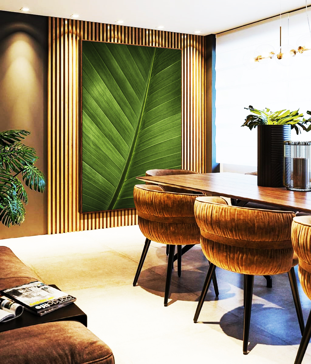 Folha verde intensa com textura natural marcante, trazendo frescor, leveza e elegância à decoração. A estética da natureza valoriza o ambiente com sensação de equilíbrio e bem-estar.