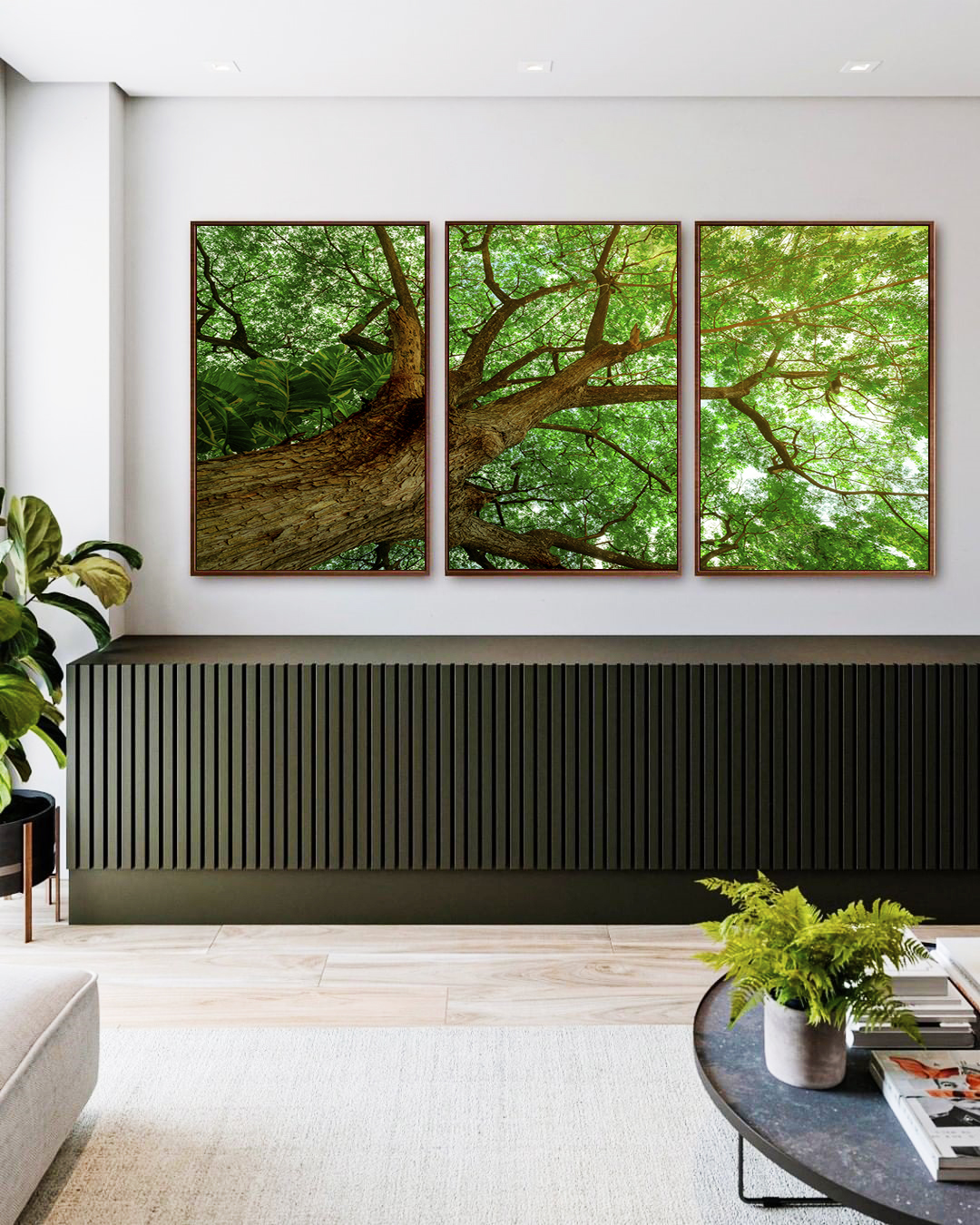 Este Trio de Quadros de copa de árvore em verdes vibrantes proporciona frescor e elegância à decoração. Perfeito para salas amplas, quartos aconchegantes ou escritórios modernos. Moldura flutuante e arte impressa em canvas refinado. Belo e Estiloso.