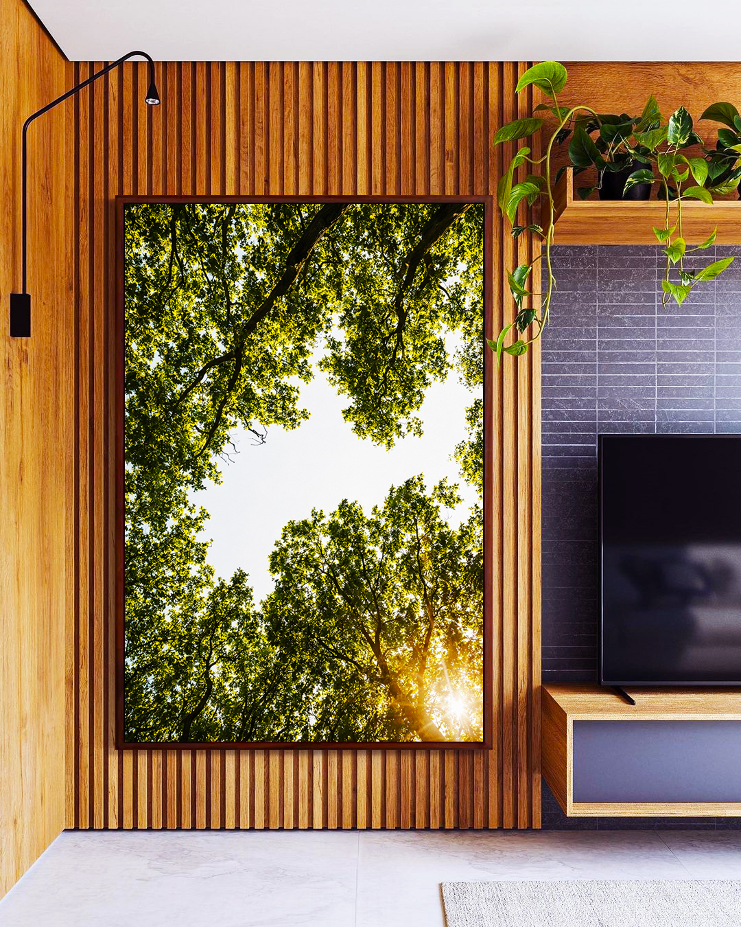 Céu claro e folhas verdes em uma paisagem suave que transmite calma e frescor. Ideal para sala, quarto ou ambientes que pedem leveza, harmonia e conexão com a natureza.