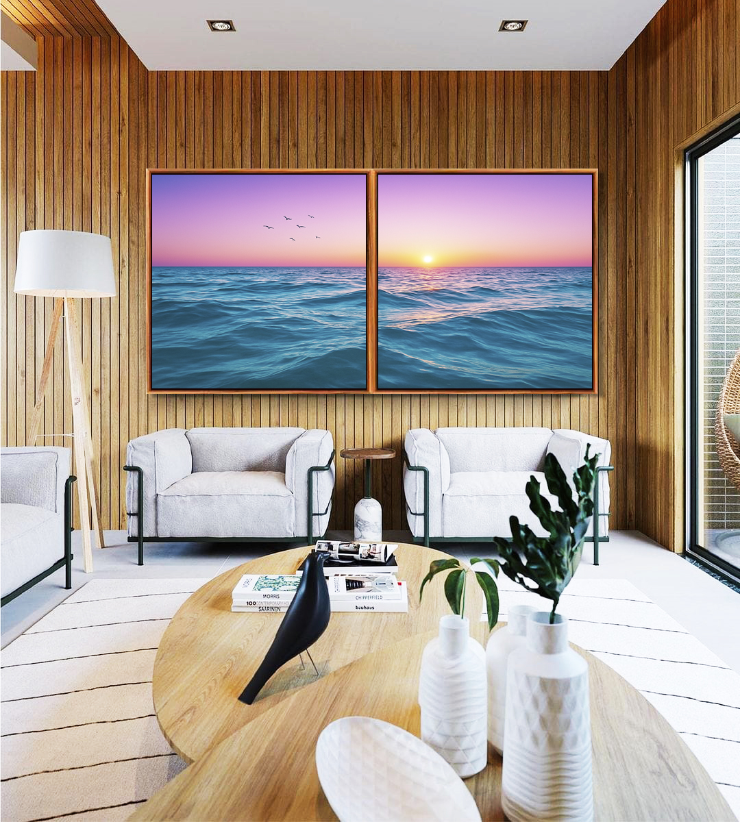 Delicado e envolvente, este Duo de Quadros Quadrados com mar azul ondulado e céu em tom rosado cria uma atmosfera suave e sofisticada. A escolha ideal para salas elegantes, quartos acolhedores, escritórios modernos ou halls de entrada marcantes.