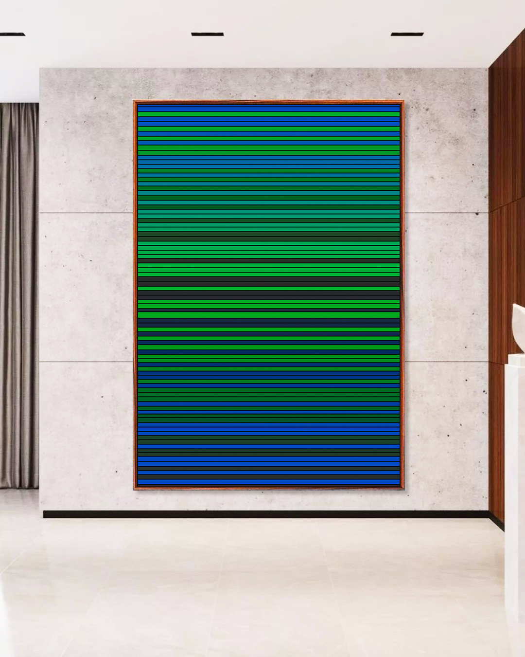 Este Quadro Vertical Abstrato em degradê une tons sofisticados de verde esmeralda e azul marinho em listras marcantes. A Moldura Flutuante valoriza a arte e traz requinte. Perfeito para transformar sua Sala, Quarto, Escritório em um ambiente elegante.