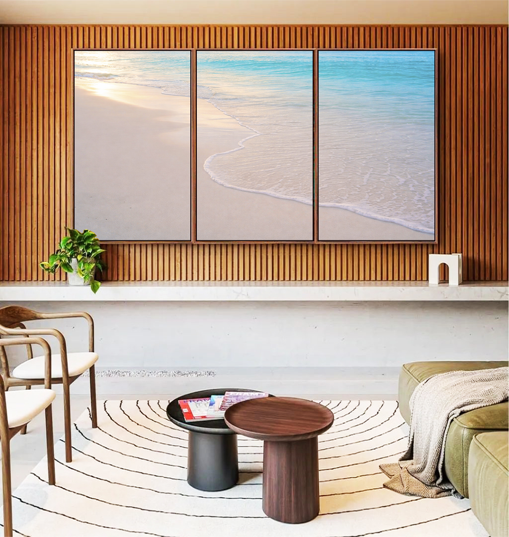 A beleza da praia em cores suaves e luminosas, transmitindo paz e aconchego. Um toque sofisticado para ambientes modernos, claros e cheios de leveza.