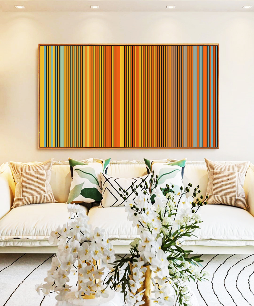 Este Quadro Horizontal Degradê com listras em amarelo ouro, laranja tangerina e azul traz energia e sofisticação. Produzido em Canvas com Moldura Moderna, valoriza salas, quartos, escritórios e halls de entrada com um toque vibrante e contemporâneo.