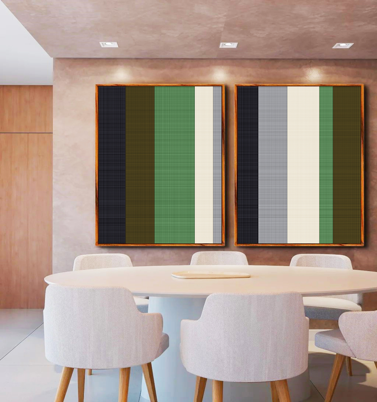 Com listras geométricas em tons de verde, cinza e branco, este Duo de Quadros expressa equilíbrio e sofisticação. A escolha ideal para compor salas modernas, escritórios elegantes ou halls de entrada com personalidade e harmonia visual.