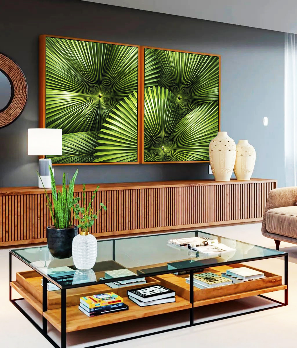 Duo de Quadros Planta Palmeira-Leque Verde Folhagem Natureza Canvas Moldura