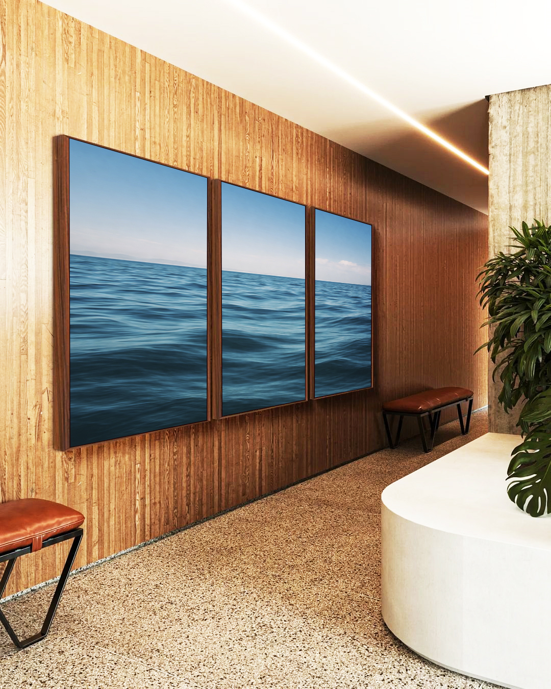 Mar azul profundo com ondas suaves e céu sereno formando cenário de tranquilidade e elegância. Ideal para ambientes como salas de estar, quartos, escritórios ou halls. Decoração inspirada na natureza, oceano e paisagem marítima.