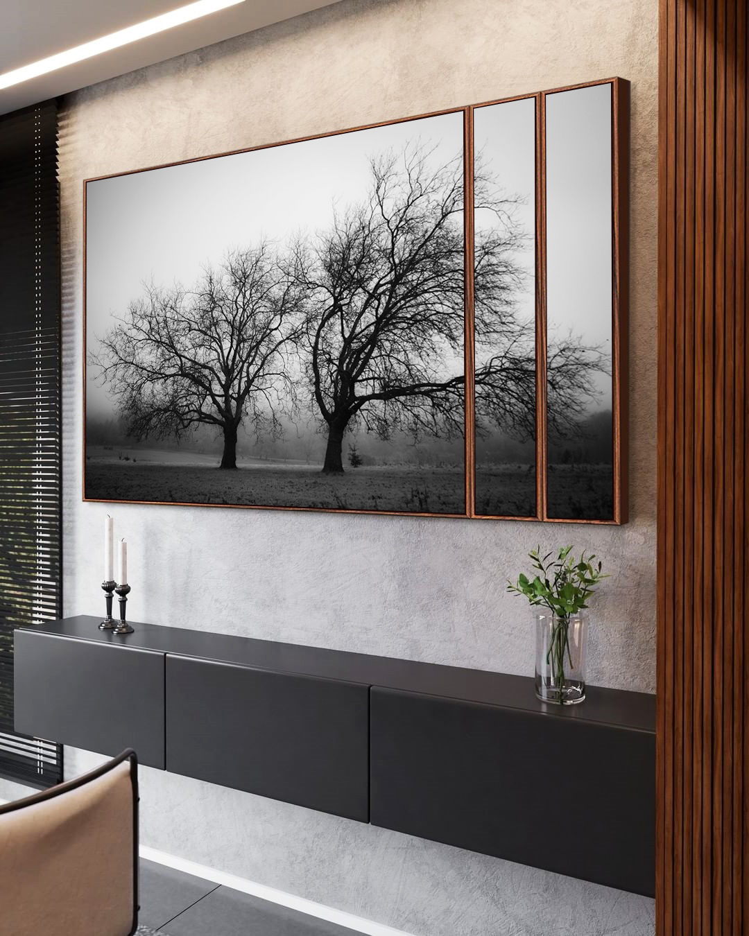 Surpreenda-se com esse Trio de Quadros Estilizados artístico de árvores em Preto e Branco. Ótimo para sala de estar, quartos, hall ou ambientes corporativos. Design elegante em canvas com moldura flutuante que valoriza qualquer parede.