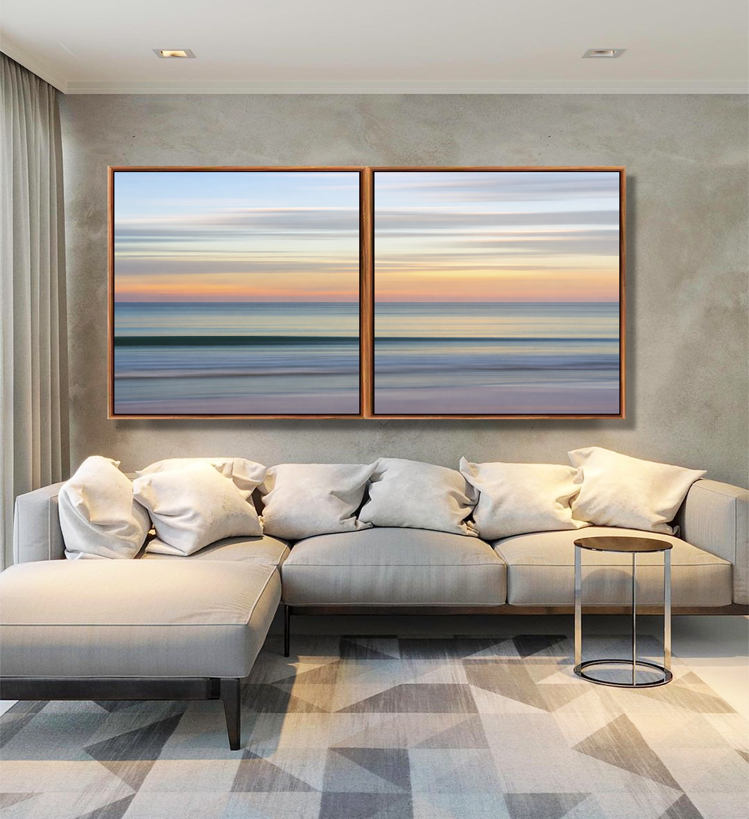 Duo de Quadros Quadrados Céu Laranja Mar Azul Prateado Movimento Canvas Moldura