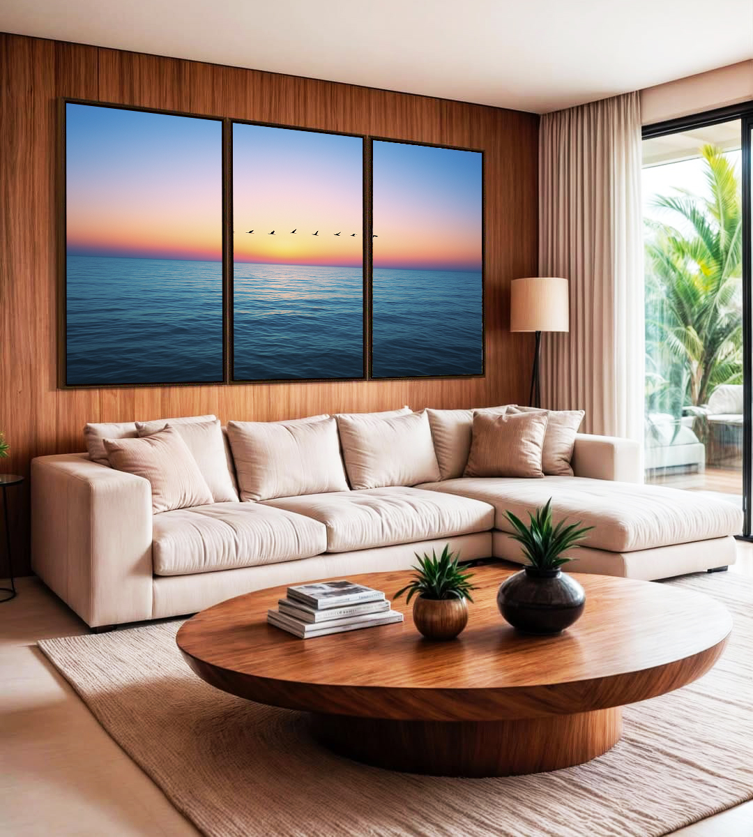 Com o azul de um mar Calmo e o pôr do sol refletindo no horizonte, este Trio de Quadros transmite serenidade e beleza natural. A escolha ideal para decorar sua sala, quarto ou hall de entrada com um toque de paz e sofisticação.