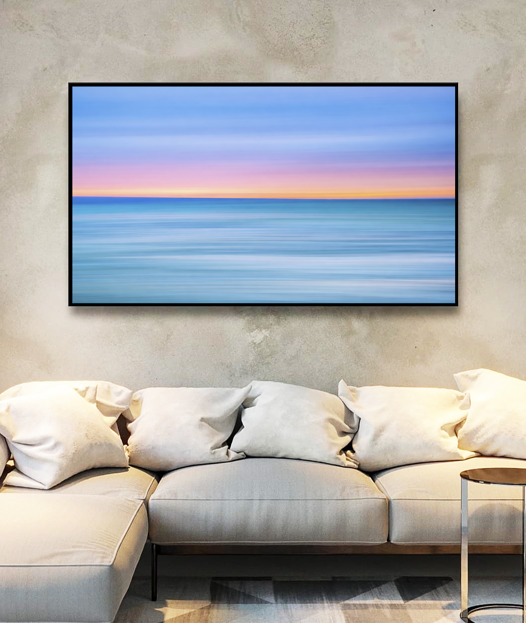 Um pôr do sol rosa refletindo no mar azul, com efeito de movimento e frescor. Ótimo para transformar quartos, salas ou escritórios em um refúgio inspirador.