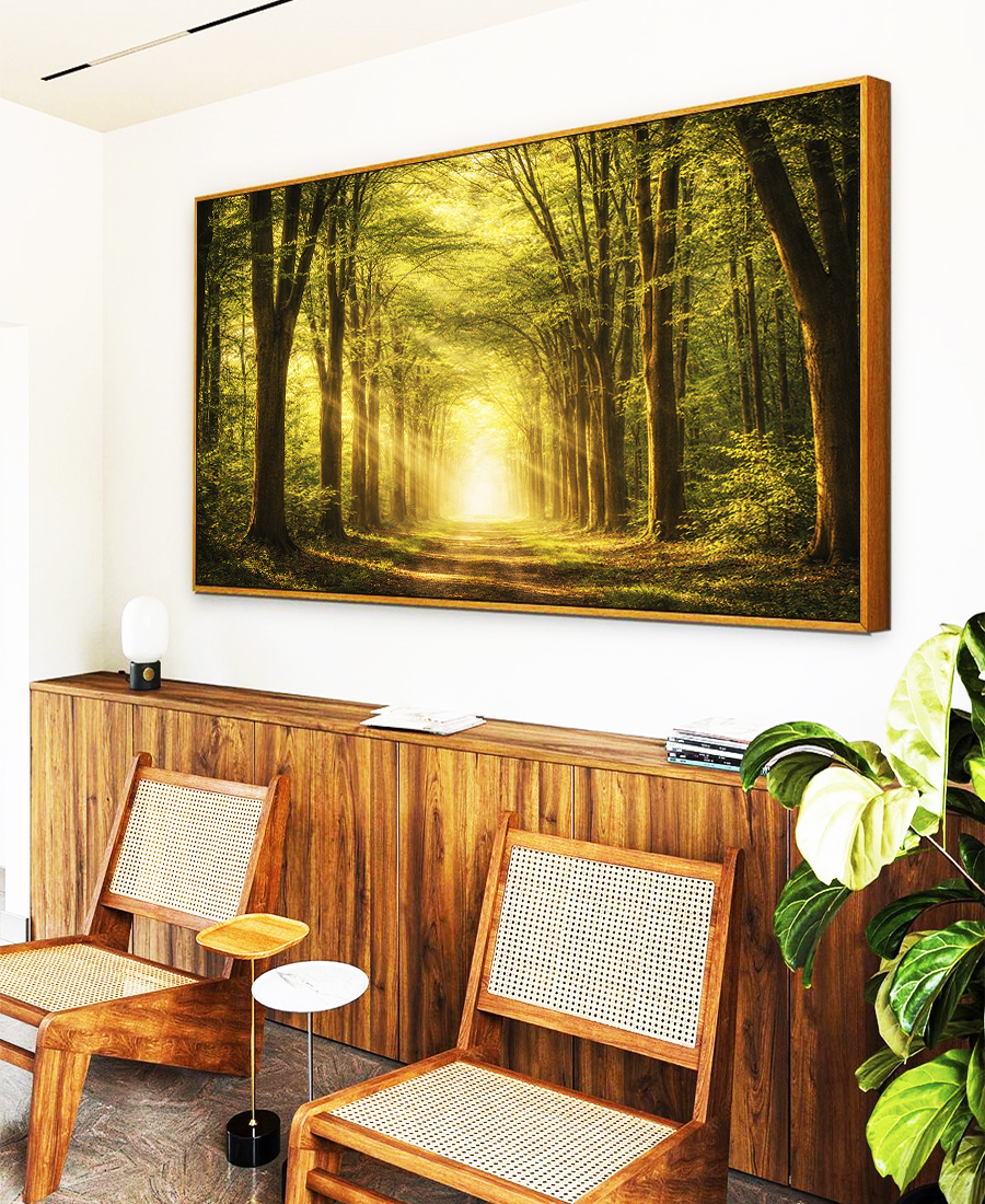 Floresta encantadora com passagem entre árvores e brilho dourado ao fundo, criando uma atmosfera de paz e contemplação. Perfeito para espaços de descanso e bem-estar. Ideal para halls, quartos ou salas que valorizam harmonia natural.