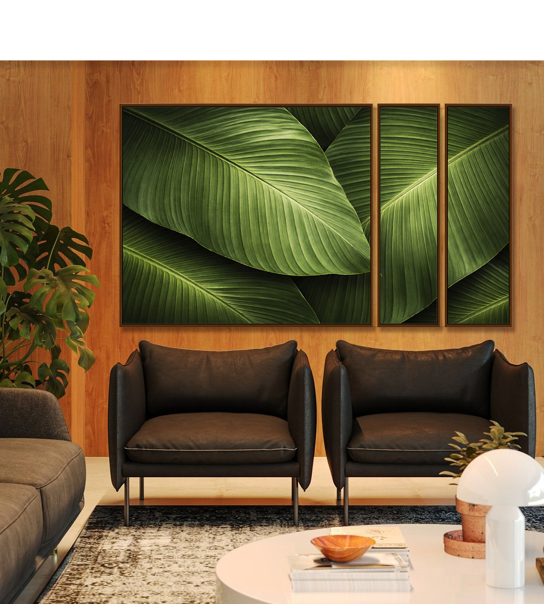 Folhagem de bananeira tropical em verde intenso, trazendo frescor e sofisticação natural ao ambiente. Ideal para sala, quarto, escritório ou espaços que pedem um toque moderno e exuberante.