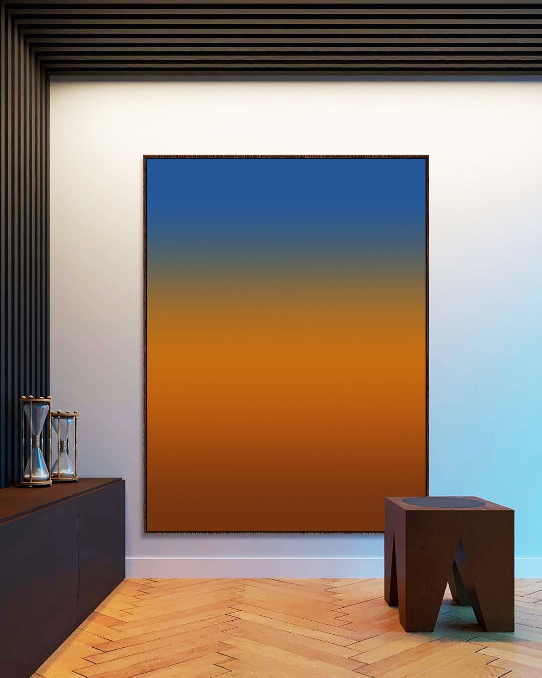 Tons marrom terra, cobre e azul em degradê suave criam um visual contemporâneo cheio de elegância. Ideal para salas, quartos, escritórios ou hall. Perfeito para decoração sofisticada, interiores modernos e ambientes com estilo refinado.