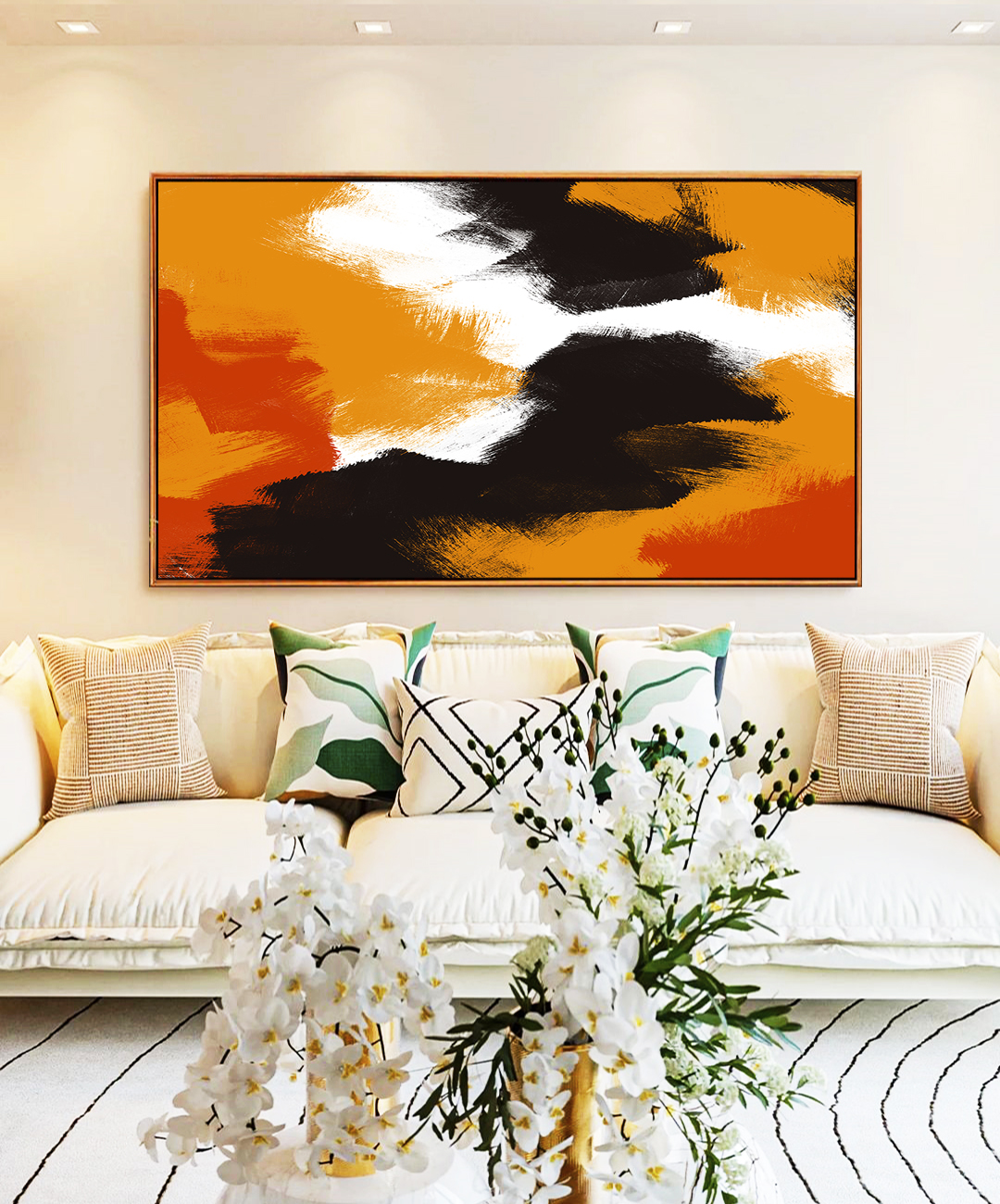 Quadro horizontal abstrato com efeito pintura em laranja, preto e branco, criando contraste, movimento e sofisticação. A escolha ideal para salas, quartos, escritórios ou halls de entrada, elevando a decoração com arte contemporânea.