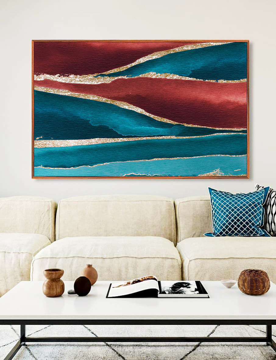 Cores vermelho, dourado e azul turquesa em arte abstrata moderna destacam energia, sofisticação e impacto visual. Arte decorativa com contraste marcante e estética atual, muito buscada na decoração. Valoriza salas, quadros e recepções.